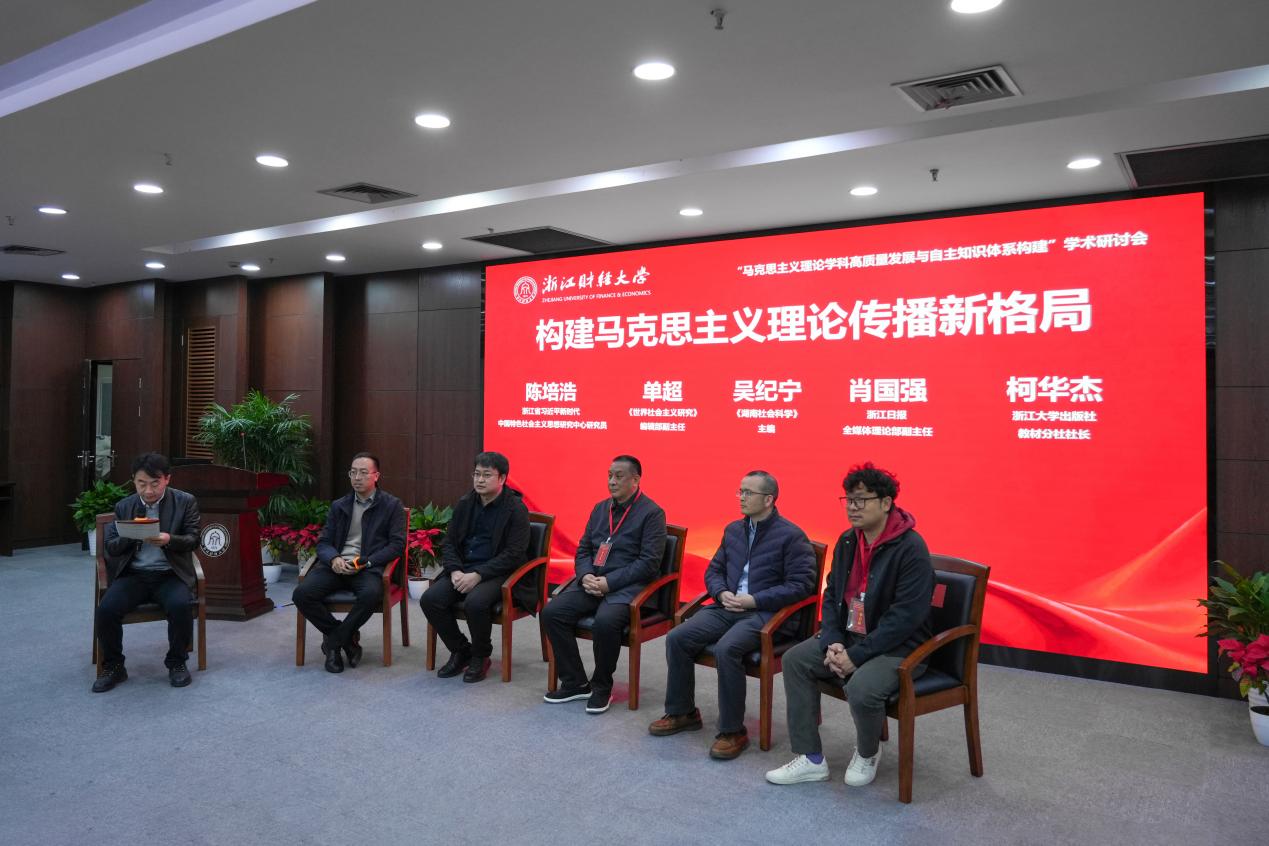 圆桌论坛环节,由浙江财经大学《财经论丛》编辑部副主编邵慰教授主持,《湖南社会科学》主编吴纪宁、《世界社会主义研究》编辑部副主任单超、浙江日报全媒体理论评论部副主任肖国强、浙江省习近平新时代中国特色社会主义思想研究中心研究员陈培浩、浙江大学出版社教材分社社长柯华杰等5位专家,聚焦“构建马克思主义理论传播新格局”这一核心议题进行探讨。