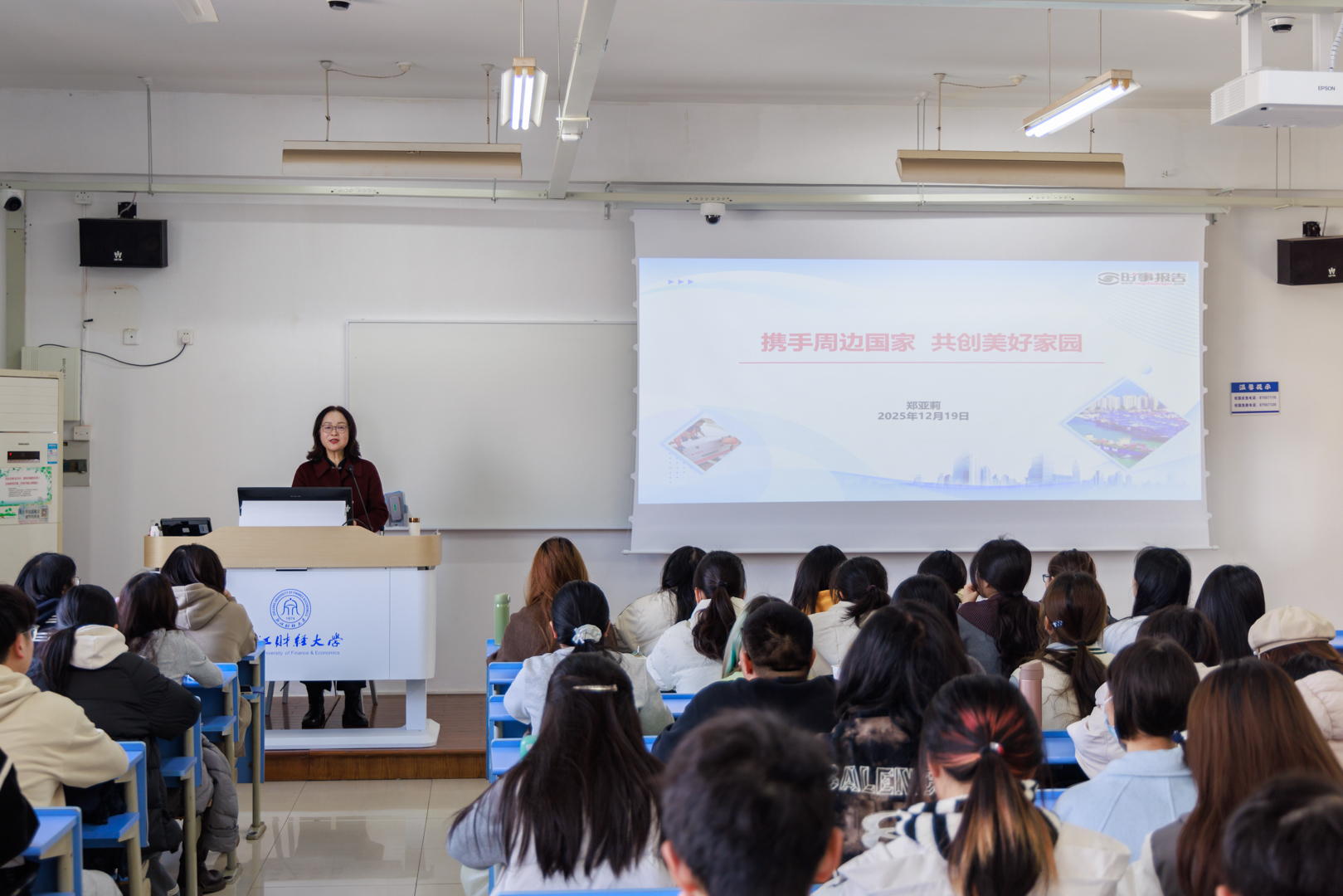 中国始终将周边外交置于外交全局的首要位置。为了深化同学们对新形势下周边外交在外交全局中的重要性的认识,12月19日,浙江财经大学副校长郑亚莉以“携手周边国家,共创美好生活”为主题,为25级工商类的学生们讲授了与时俱进的周边外交理念与新时代外交工作的历史性成就。通过宣讲中共二十届四中全会精神和浙江省委十五届八次全体会议精神,郑校长在周边外交的背景下剖析了中国机遇与专业使命。