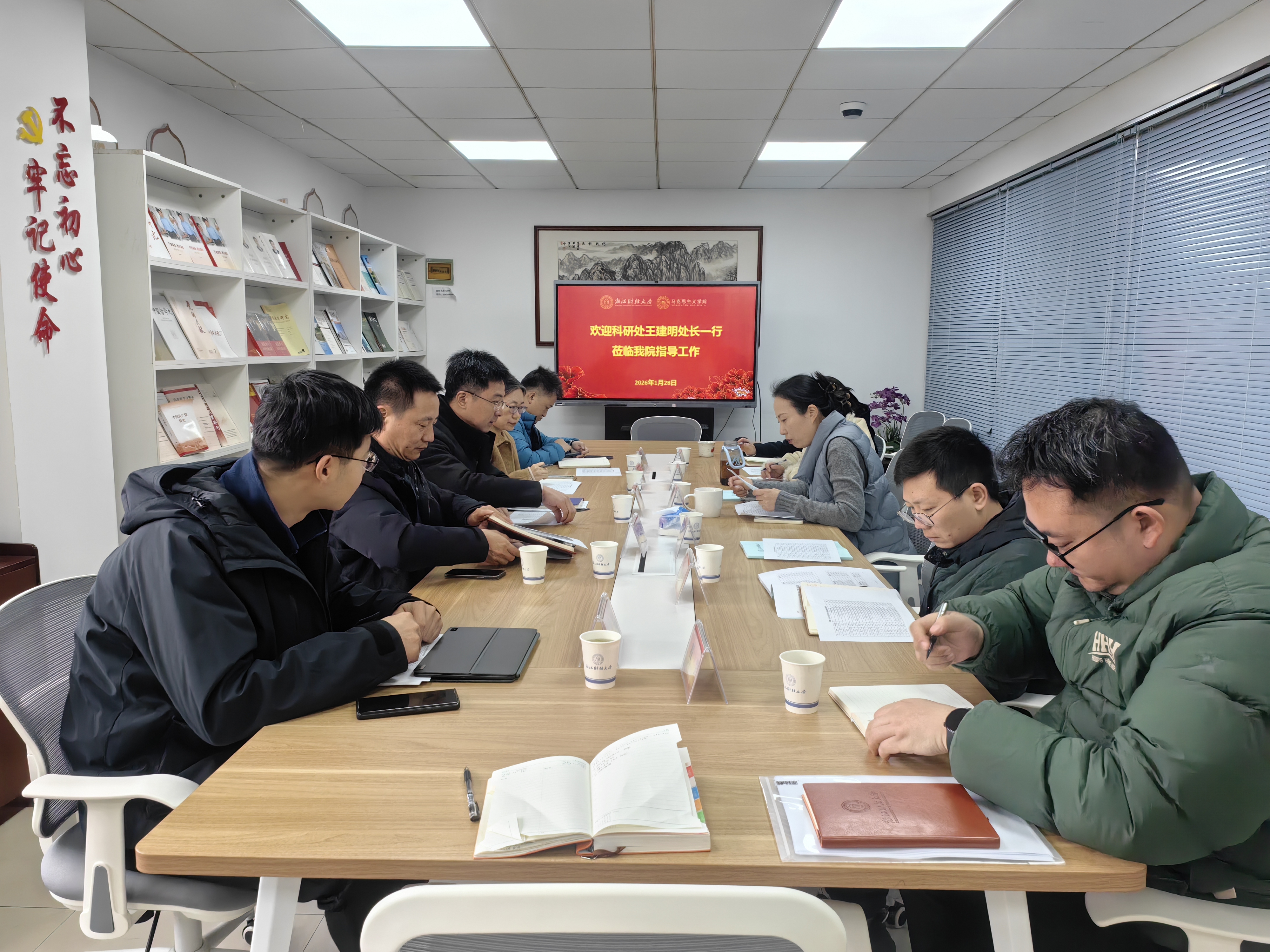 2026年1月28日上午,校科研处处长王建明、副处长裴志军、专聘副职田庆宏,带领项目管理员俞晓、迮勇一行五人莅临我院,围绕科研管理提质、国家课题组织推进等工作开展专项调研指导。学院副院长潘旦主持调研座谈会,相关课题申报教师代表参加会议。